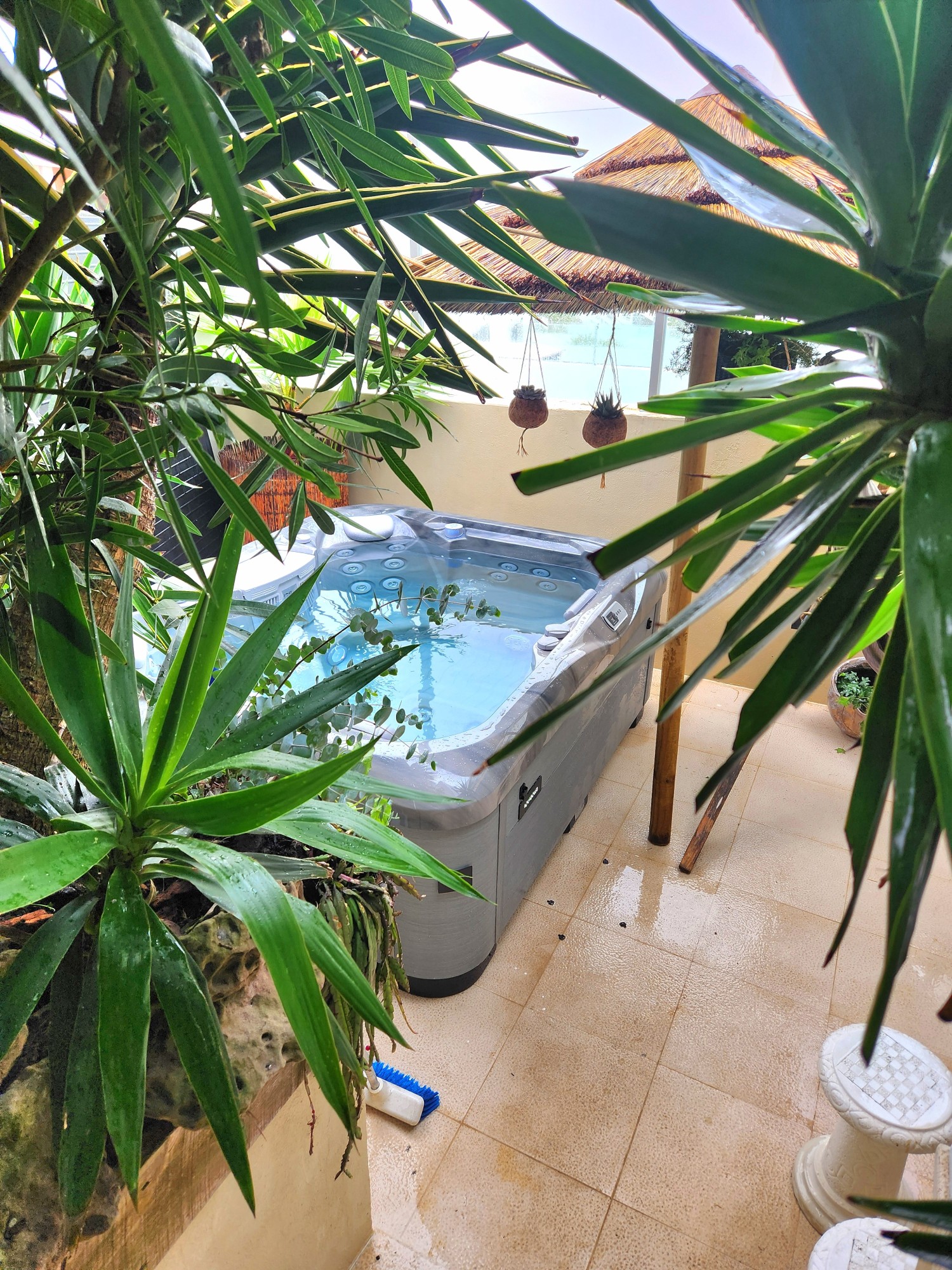 Villan outdoor spa -alue kruunaa elämyksen: spa-alue on rauhallinen zen-henkinen keidas, jota ympäröivät jukkapalmut ja vihreä kasvillisuus, luoden harmonisen tunnelman kuin pienessä trooppisessa puutarhassa. Keitaassa on käytössänne 4 henkilön ulkoporeallas stereojärjestelmällä ja tunnelmallisilla LED-valaistuksilla, perinteinen suomalainen sauna sekä infrapunasauna. Kokonaisuuden täydentävät suuri uima-allas ja tunnelmallinen ulkosuihku, jotka kutsuvat rentoutumaan ja nautiskelemaan vuorokauden ympäri. Kymmenen minuutin kävelymatkan tai vaihtoehtoisesti muutaman minuutin pyörämatkan päästä löytyy upea Areia Brancan ranta, jossa pääsee uimaan tai kokeilemaan surffausta. Rannalla on myös erittäin hyviä ravintoloita missä nauttii maun mukaan vaikkapa mereneläviä tai italialaista kiviuunipizzaa.